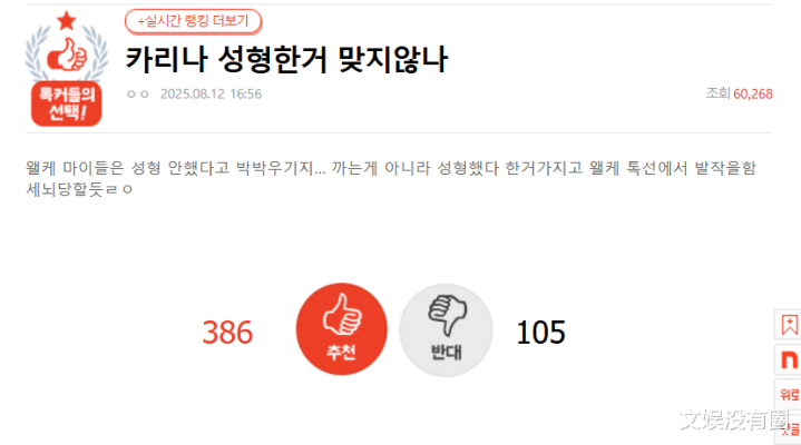 - 最搞笑的就是那群人老是把“整过”挂嘴边,哈哈哈。不爽你们也去整啊,干嘛逮着个明摆着好看的人天天念经?Karina 那些头型、脸型、比例天生就吊打,根本不是整得出来的,还整天叨叨整不整的。要是觉得割个双眼皮就能变成她,那就去割呗,谁拦你们了?