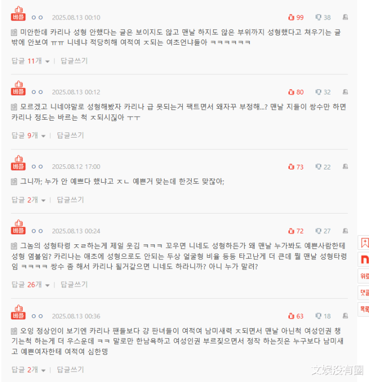 - 可我根本看不到谁说 Karina 没整,全是把没动过的地方也硬说成整过的帖子,哭哭。你们差不多得了,一群天天装女权的女疯子,笑死人。