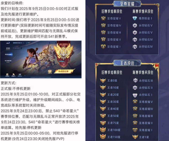 王者荣耀S41新赛季下周开启,这基本是可以确定的。没错,王者荣耀正式服已经官宣,25号的时候,会不停机更新S41赛季。这样一来的话,18号抢先服就要开启新赛季了,毕竟之前都是如此,抢先服是比正式服早一个星期的。另外一方面,王者荣耀新赛季的段位继承公布了,玩家们可以根据自己的段位,来看看自己新赛季继承的段位是什么。目前,传奇王者150星的玩家,可以在新赛季直接继承到最强王者1星,而王者30星以下的玩家,将继承到钻石1。所以,本赛季还是最好达到王者30星吧,这样离王者还近一点,哈哈。