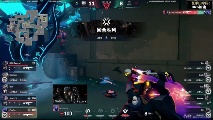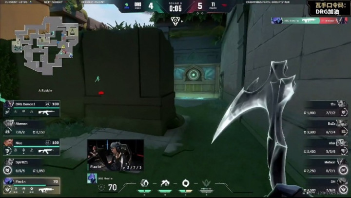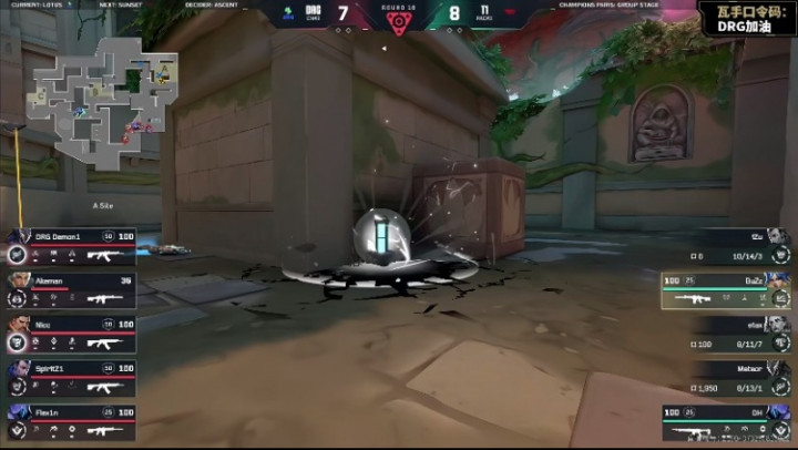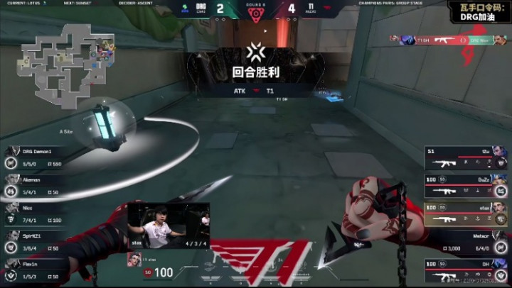 第十七局:DRG开局在A点收下一人,随后T1在C点前压的夜戮也被收下,DRG直接多人集合进到C点,T1回防但是没用枪械被DRG拿下胜利!