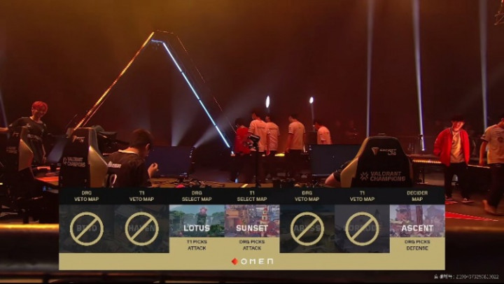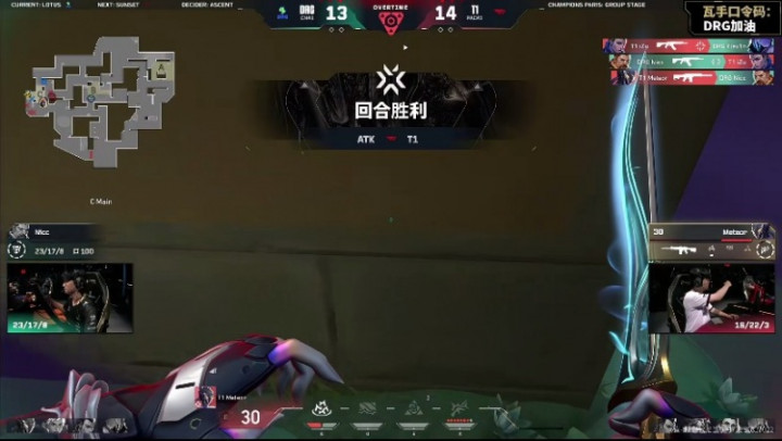 第二十二局:DRG开局在B点骚扰,随后夜戮开大直接进攻C点,夜戮收下幽影之后选择提速C点成功完成进点下包,后续T1回防被全部架住,T1大狙选择保抢但是被DRG收下,DRG拿下胜利!